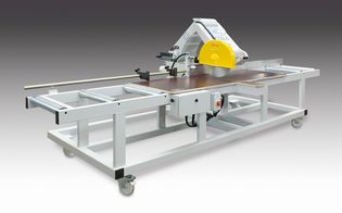 Mit Sägetisch 4060 mm lang, Lenkrollen, hinterer Materialanlage, Pendelanschlägen und Messvor-richtung. Auch als Gehrungssäge lieferbar.